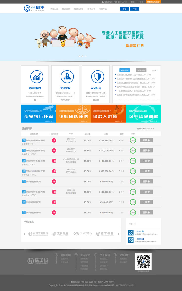 簡(jiǎn)介:珞珈貸是由30余名武漢大學(xué)校友發(fā)起的校友社交金融平臺(tái),運(yùn)營(yíng)法律主體為廣州離離草投資咨詢有限公司,公司注冊(cè)資本金500萬(wàn)元人民幣。我們立志將珞珈貸打造成為全球武漢大學(xué)校友的核心投融資平臺(tái),滿足校友的投融資需求,為校友提供最為安全、權(quán)威、高效的投融資服務(wù)。珞珈貸同時(shí)面向全體社會(huì)投資者,提供安全高效的投資渠道。我們專注于為有資金需求和投資需求的校友搭建一個(gè)公平、透明、穩(wěn)定、高效的校友互助金融平臺(tái)。