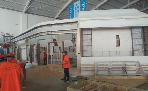主要材料:木板、方鋼、燈片、有機片、LED燈、環保阻燃地毯、玻璃展柜、環保阻燃乳膠漆。