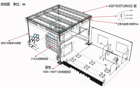 主要材料:防火板、方鋼地臺、軟膜燈箱、P2LED屏、液晶多媒體電視、高清寫真、強化木地板、線型燈、花藝等。