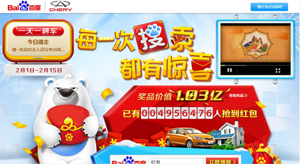 看看上圖,CHERY的標(biāo)志很明顯吧?據(jù)悉,百度的獎(jiǎng)品里就有CHERY的汽車喔!當(dāng)然,要參加搜索才能積累拿紅包的分值,用戶還可以通過(guò)下載百度的瀏覽器、百度搜索入口以及百度語(yǔ)音助手來(lái)參加搜索,手機(jī)搜紅包,不但沒(méi)有次數(shù)限制,中獎(jiǎng)概率也倍增,看來(lái)百度對(duì)于移動(dòng)手機(jī)市場(chǎng)的搜索份額占有也是志在必得呢!