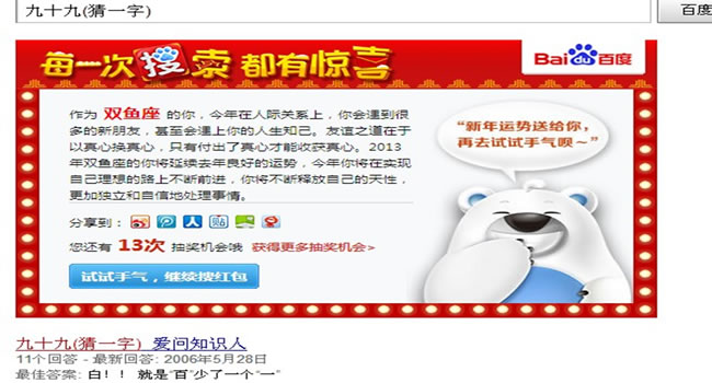 大家看到了嗎?筆者第一次抽到的問(wèn)題是“何潔的職業(yè)是什么”,第二次抽到的問(wèn)題是“九十九猜一字”,筆者連續(xù)猜了四次,百度都會(huì)用各種方法將答案呈現(xiàn)給我,而得到的紅包卻是一樣的?磥(lái)百度的禮物不是那么容易拿得到手的,想要將垂涎三尺的大禮包拿到手,還得再下一番功夫才行。
