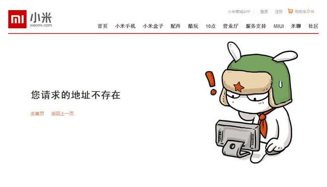 我們先來看一下在手機銷售行業(yè)一枝獨秀并憑此獲得中國2012年度經(jīng)濟人物獎的雷軍的小米。這就是小米手機官網(wǎng)的404頁面,很普通,一個圖片,一句“您請求的地址不存在”,兩個選項“去首頁”或者“返回上一頁”就完事了。與小米手機的別出心裁來比真是有點讓人失望呢!