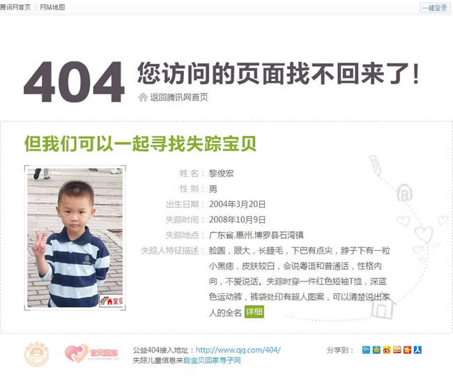 這個還是騰訊,不過除了騰訊之外,一些大型網(wǎng)站如百度等也在使用這種404頁面設(shè)計,即用戶因指令錯誤無法到達目標頁面時,頁面直接跳轉(zhuǎn)到公益頁面,這種404頁面不能算得上創(chuàng)意(當初這種404頁面首先被百度所運用的時候,曾有人撰文指出百度是在抄襲國外網(wǎng)站的做法,此為外話不提),但是還是很多大型網(wǎng)站都會采用。由于這種404頁面是大型網(wǎng)站特別是靠用戶流量吃飯的網(wǎng)站來說,不但“接地氣”,體現(xiàn)了科技公司對弱勢群體的關(guān)注,而且又能使自己的404頁面不至于那么單調(diào),一舉兩得。