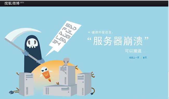 這個是搜狐微博的。可謂是意外的發(fā)現(xiàn),早上點微博的時候出現(xiàn)的。真是充滿了中國神話的色彩,一方面用死神代表服務(wù)器出現(xiàn)了問題,另外一方面用一堆看不懂的符號來表示外星語言,旁邊加上注釋“服務(wù)器崩潰,可以撤退……”碰上這兩個家伙,真是應當馬上撤退呀!
