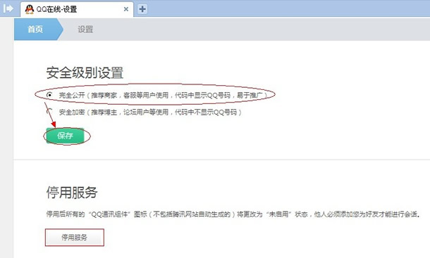 2、點(diǎn)擊“設(shè)置”按鈕,選擇安全級(jí)別為“完全公開(kāi)”,保存。此時(shí)QQ客戶就會(huì)恢復(fù)在線狀態(tài),可以接收來(lái)自網(wǎng)頁(yè)上的臨時(shí)會(huì)話。請(qǐng)留意下面“停用服務(wù)”按鈕,如果點(diǎn)擊此按鈕,將會(huì)停止所有的網(wǎng)頁(yè)QQ在線服務(wù),因而如果要停用某個(gè)網(wǎng)頁(yè)的QQ在線服務(wù),可以點(diǎn)擊此按鈕。