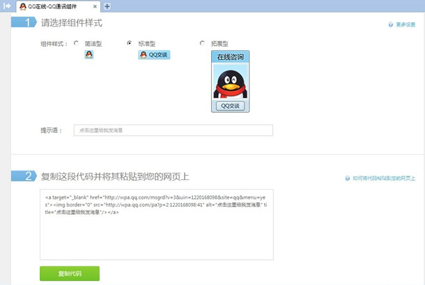3、點(diǎn)擊網(wǎng)站右上方的“QQ通訊組件”按鈕,可以根據(jù)自己的喜好選擇相應(yīng)的QQ在線客戶顯示形式。此步驟需要將代碼復(fù)制黏貼到你的網(wǎng)站代碼中方可啟用。途徑:原網(wǎng)站QQ在線客服代碼==》重新設(shè)置后的QQ在線客戶代碼==》保存生成即可。不熟悉網(wǎng)站代碼的可以請(qǐng)網(wǎng)站建設(shè)公司幫忙設(shè)置。