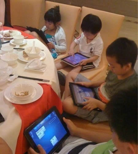 iPad。這一張,被認(rèn)為是現(xiàn)在兒童生活的寫照。幾個(gè)兒童碰面,不是一起玩,而是各種抱著自己的iPad跟網(wǎng)絡(luò)虛擬世界交流著。它們懂與虛擬對(duì)手斗地主,進(jìn)入游戲室玩游戲,各種dota,lol,甚至還會(huì)聊微信,刷微博,但是他們與現(xiàn)實(shí)世界中的同伴是分離開(kāi)來(lái)的,除了上課和吃飯睡覺(jué)之外,他們就抱著Ipad和iPhone手機(jī)沉浸于自己的世界之中。因而會(huì)越長(zhǎng)越孤單。