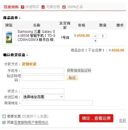 的時候,會跳轉到商品源網(wǎng)站,并且需要經(jīng)過一系列的注冊驗證后才能購買。在這方面,百度微購顯得更加快捷方便。只要在百度搜索某一款商品,百度微購就會顯示所有合作電商平臺的商品,商品配有一張圖片、名稱,來源,以及價格。也就是說,同一款產(chǎn)品,只要通過百度微購即可了解到各平臺的售價。如三星Galaxy S4手機,當當網(wǎng)售價最高,為5799元,京東商城的售價是4888元,1號店最低,為4556元。如果覺得合適,還可以直接下單購買,只要選擇訂購數(shù)量,輸入聯(lián)系方式即可購買,目前百度微購僅支持貨到付款方式。