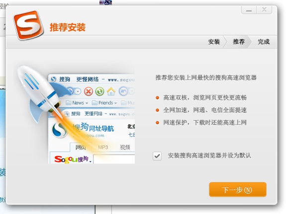 搜狗的安裝頁面,我一定是看花眼了,不然以搜狗在流氓界這么大的知名度,怎么可能就捆綁一個瀏覽器就放過了我們?唔,這背后一定還隱藏著什么驚天大陰謀!